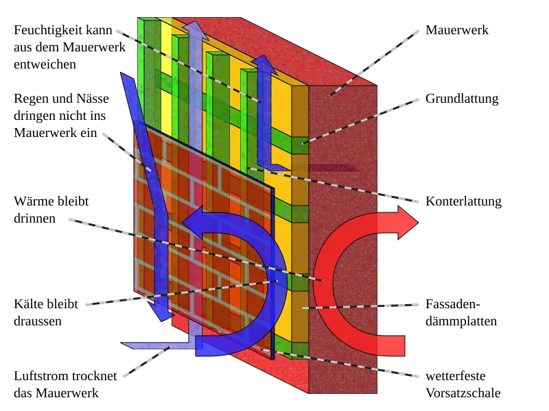Eine VHF ist ein mehrschaliges Fassadensystem: Die Bekleidung wird mit Abstand zur tragenden Wand montiert. Der Hinterlüftungsraum sorgt für kontinuierliche Luftzirkulation – die Dämmung bleibt trocken und leistungsfähig. Ergebnis: eine beständige, pflegeleichte Fassade mit stabiler Optik.